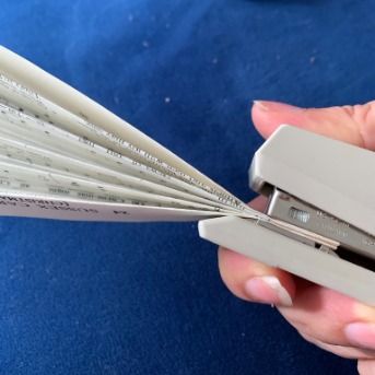 Step 3: Pinch one end of a folded page and, about an inch from the top, staple. Now your angel has a body.