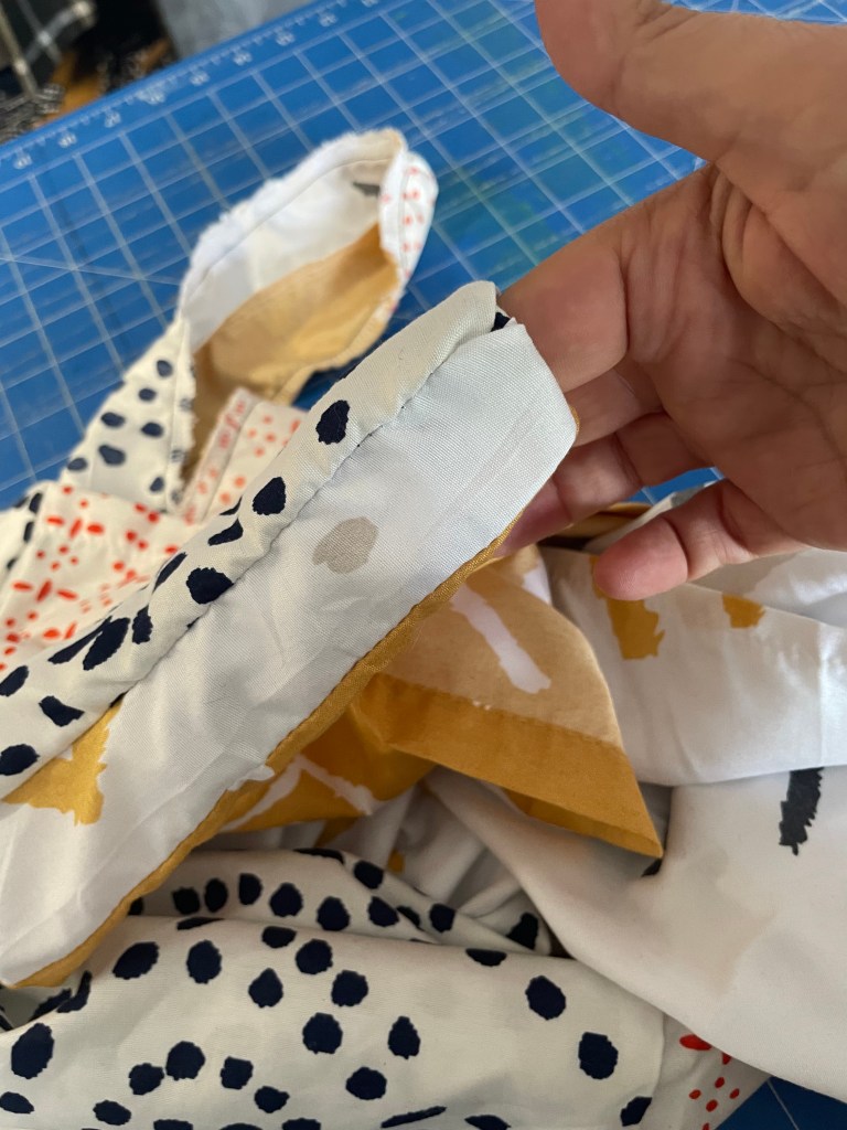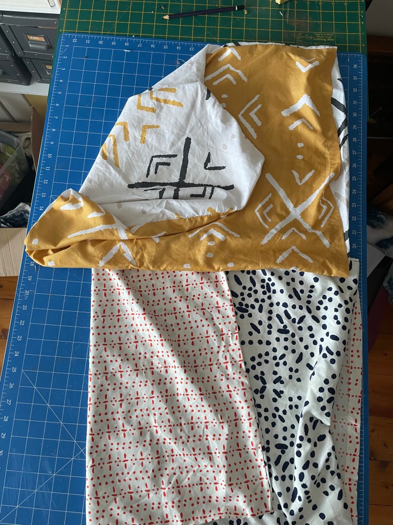 Unfold your pillowcase sandwich and then pin and sew around the opening you’ve just created. You should end up with a bag ‘tunnel’ that is open at the bottom. I overlocked first to avoid any internal fraying, but you don’t really need to. You can just straight stitch with a regular sewing machine. I do both.