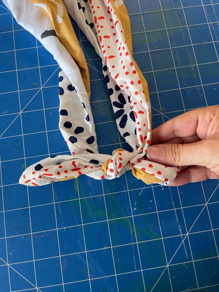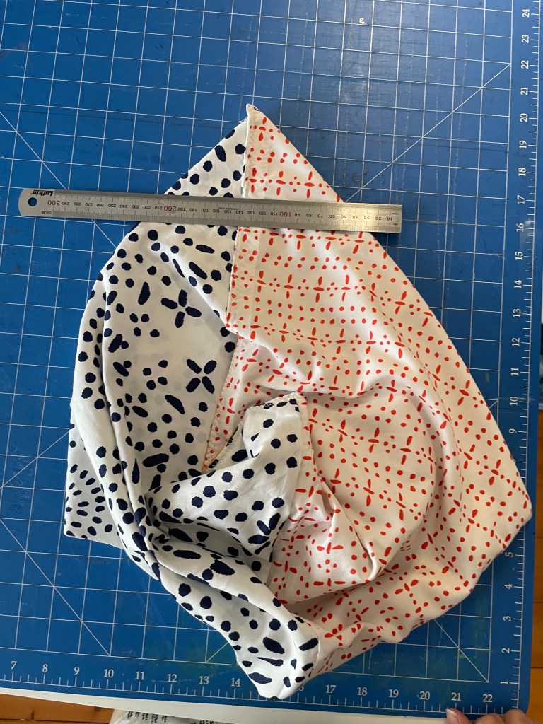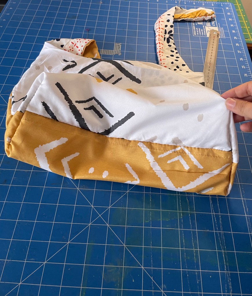 To create a bit of shape and give a boxy bottom to your bag, sew triangles across both bottom corners. As I type this I realise it probably doesn’t make sense unless you’ve done this kind of thing before. Here is a picture that may or may not clarify. If it doesn’t, and you are done, just skip to the step where you tie your handles together. This is not strictly necessary.
