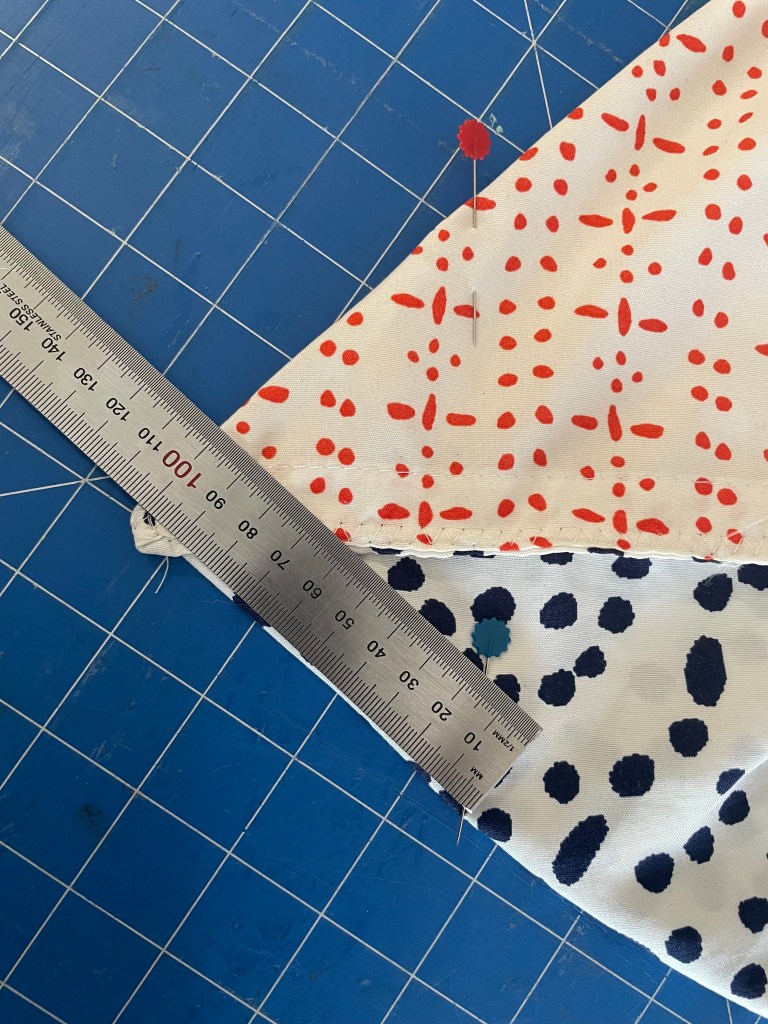 I started my corners about 10cm down from the peak and used a zigzag stitch.
